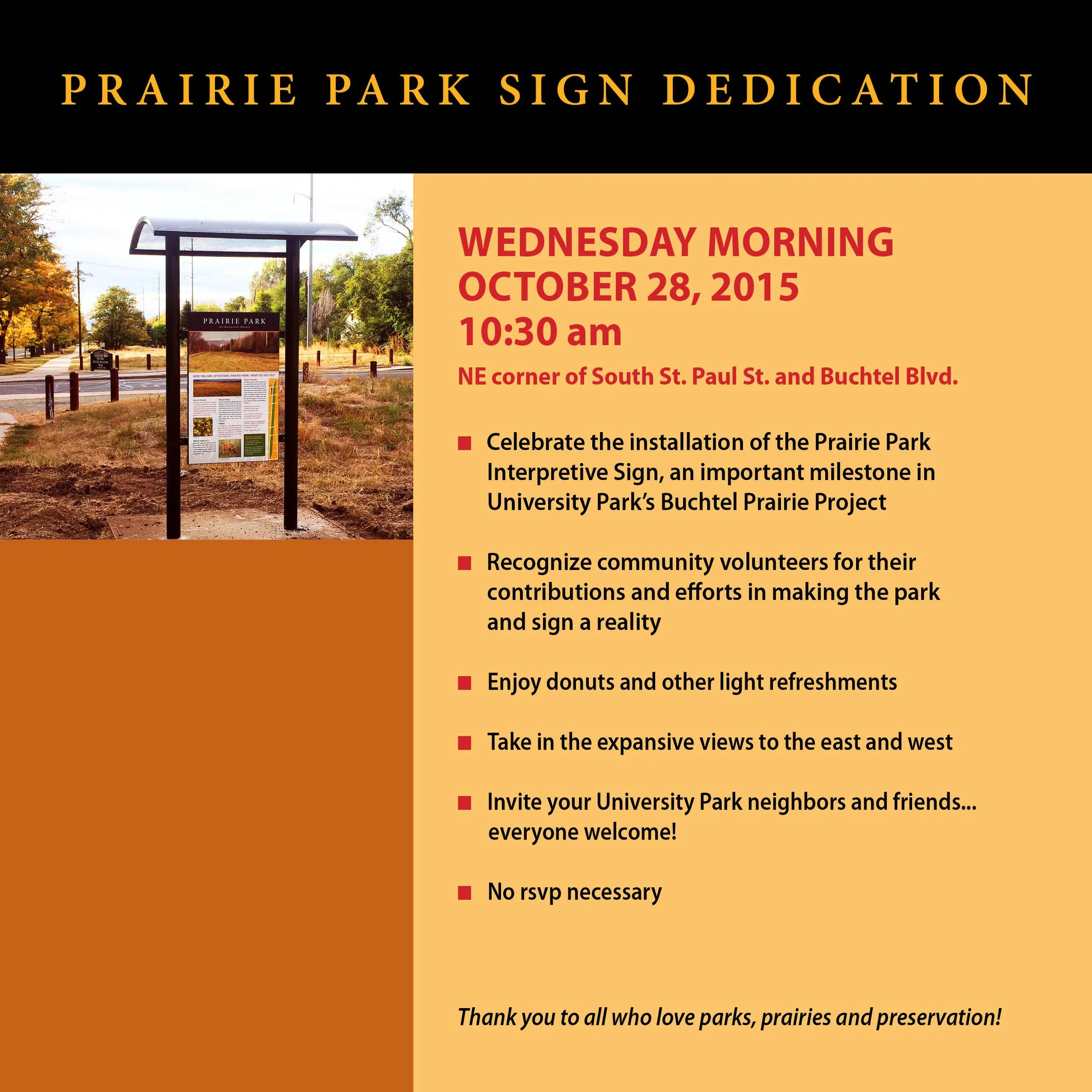 Buchtel Trail and Prairie Park is a Denver park that was originally a railroad bed and right-of-way. The 14 acre strip of land lies underneath power lines and runs from east to west for 10 city blocks along Buchtel Blvd. near I-25, allowing an unobstructed view of the mountains. The park was the brainchild of Diana Helper, a Denver community advocate who looked beyond the vacant and trash-filled land, and envisioned an open space that would be a reminder of the long gone prairie, featuring a trail and lush native prairie grasses. Diana’s quest to turn the land into a city park was tireless. In 2015, after 30 years of advocating with the Denver City Council, the Parks and Recreation Department and local community groups, Prairie Park became a reality.