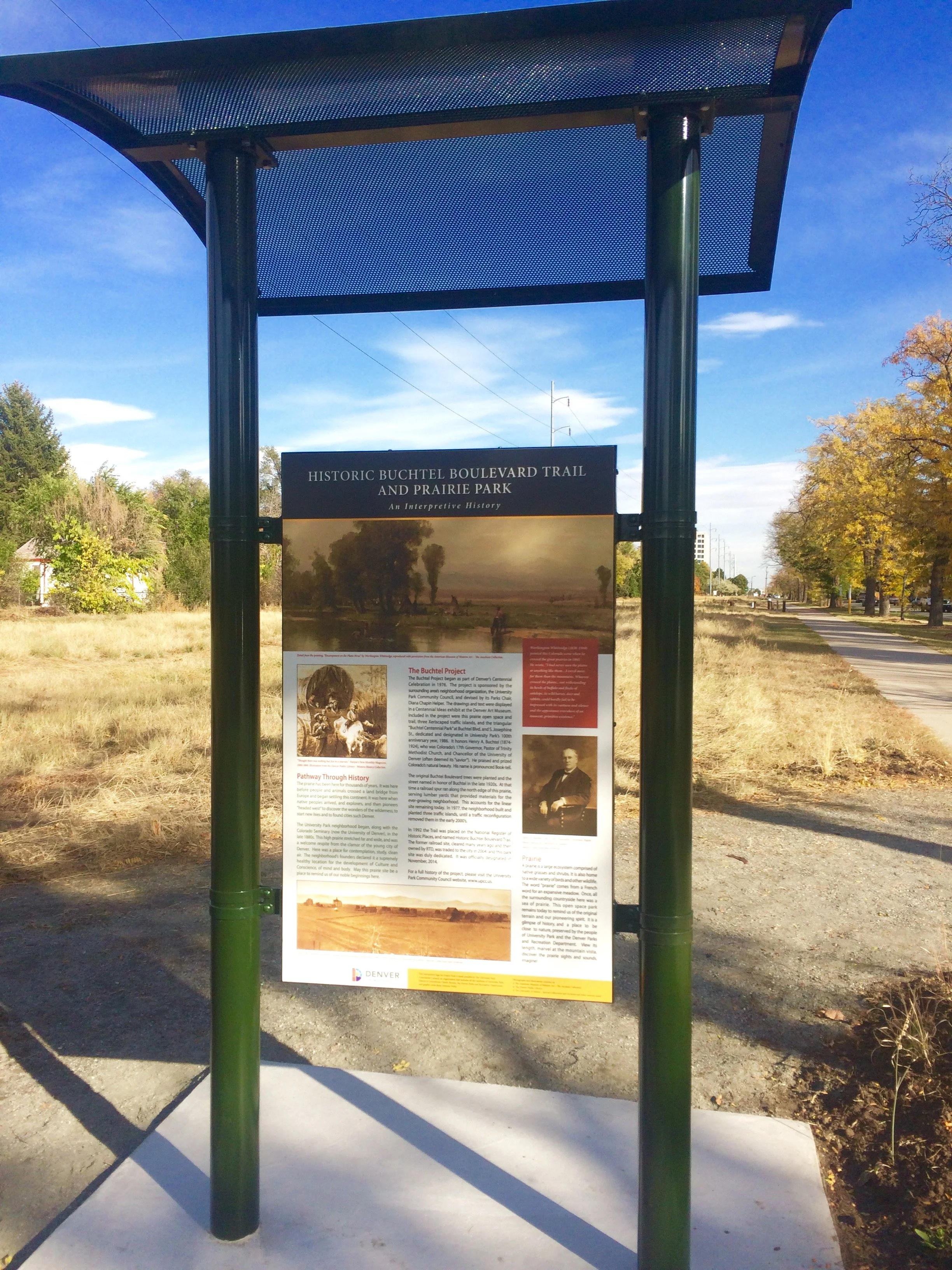 Betsy Johnson Design worked with Helper and the Denver Department of Parks and Recreation to design interpretive signage for the park with descriptions of the history of the area on one side, and natural history information on the other. The architectural framework is a standard fixture that Denver uses in other city parks. The sign design itself incorporates the City and County of Denver’s logo and graphic standards.