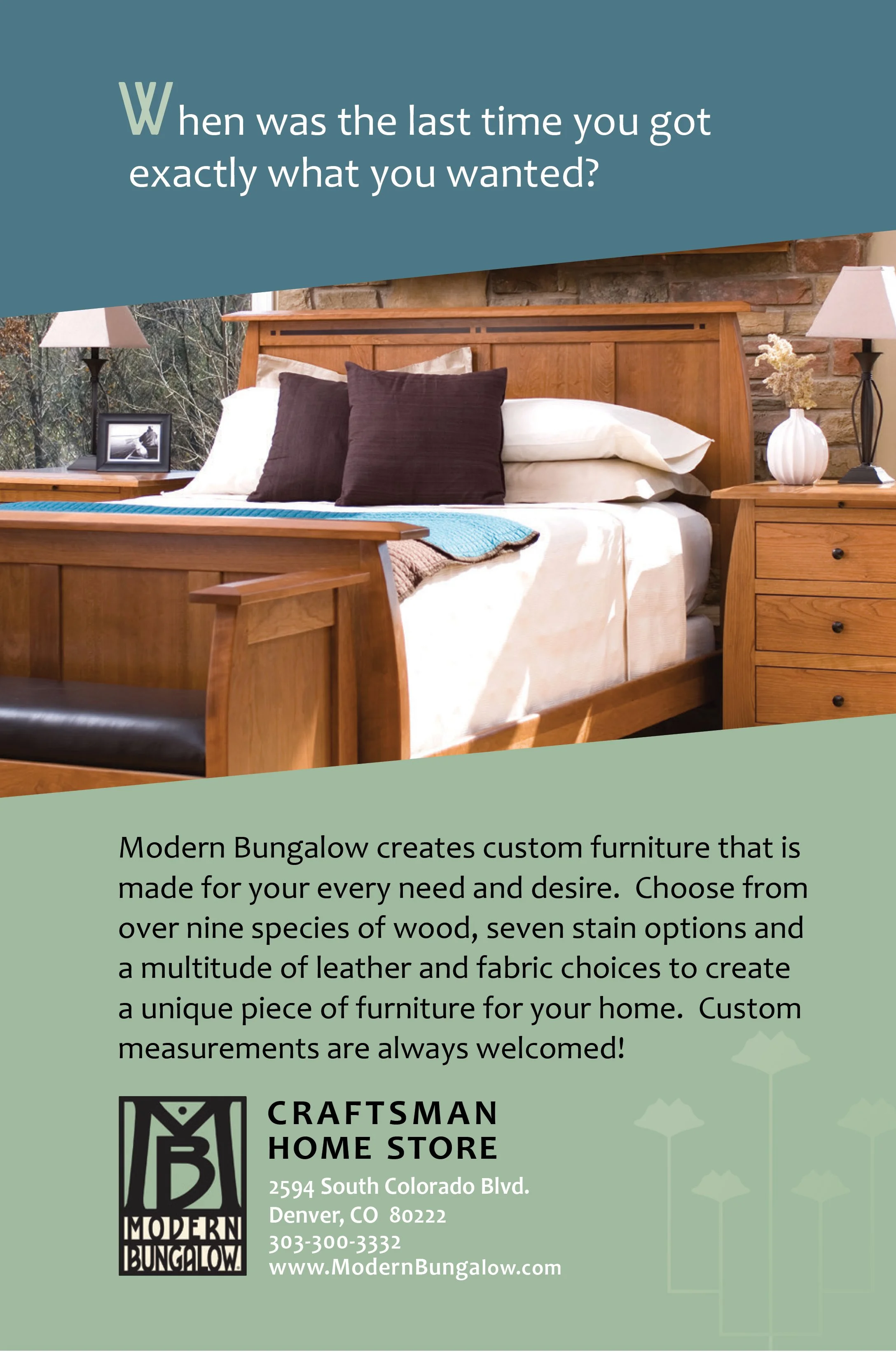 The goal of this ad was to educate the consumer about ordering custom-made Amish furniture from Modern Bungalow. Betsy Johnson Design worked with the existing graphic standards of Modern Bungalow to develop the design of this ad. The Arts and Crafts gingko leaves design element and brand of Modern Bungalow are paired with a contemporary diagonal window.
