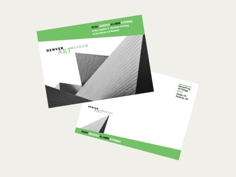 Betsy Johnson Design was hired to created an invitation mailer for a school alumni gathering at the Denver Art Museum. The design featured photos of the angular Daniel Libeskind building and used graphic elements that echoed the architecture. Colors matched the DAM’s branding at that time.