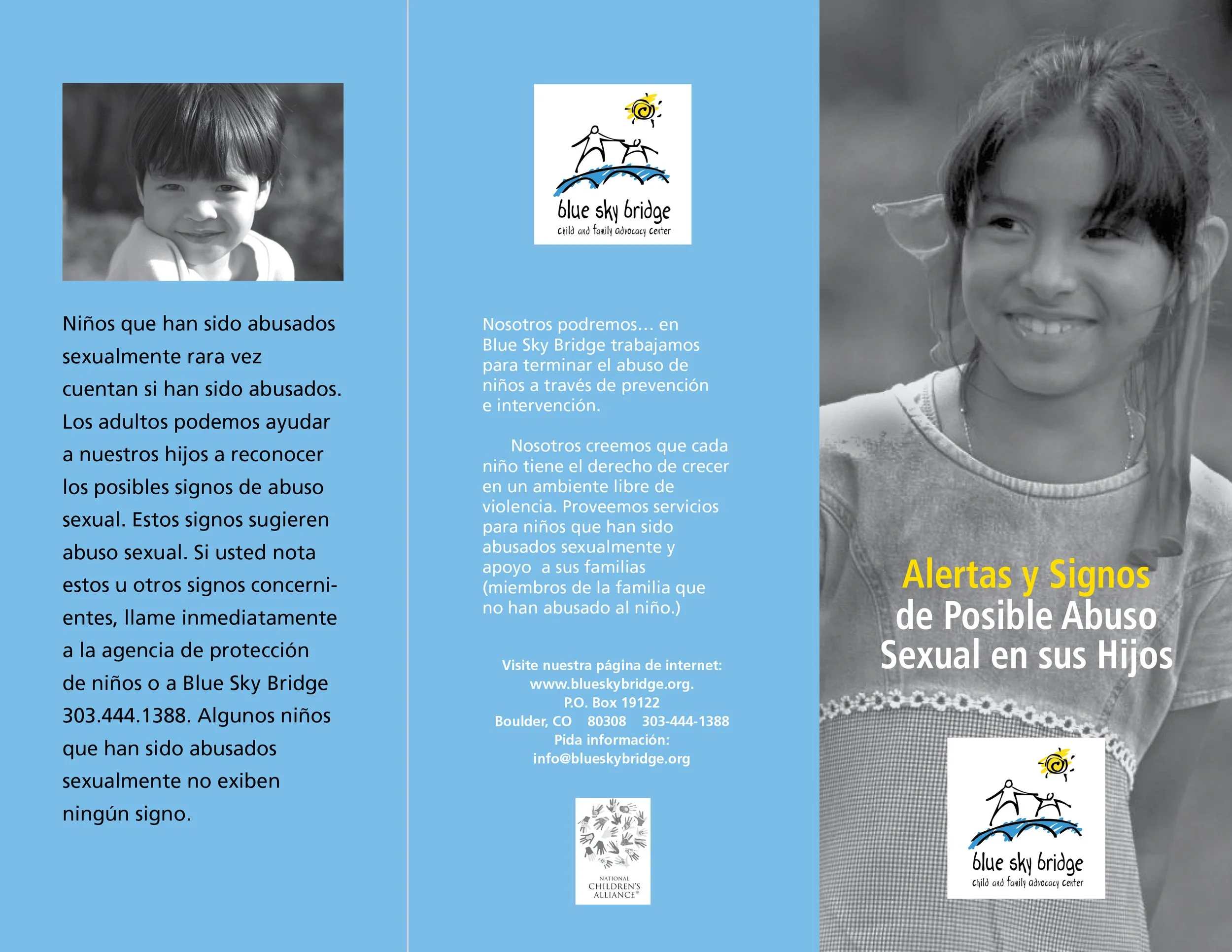 Blue Sky Bridge is a child abuse intervention and education organization based in Boulder, Colorado.. Betsy Johnson Design was hired to design bilingual brochures and posters that provided education for the community about the signs of child abuse. Betsy Johnson Design also designed and produced a monthly newsletter for BSB.